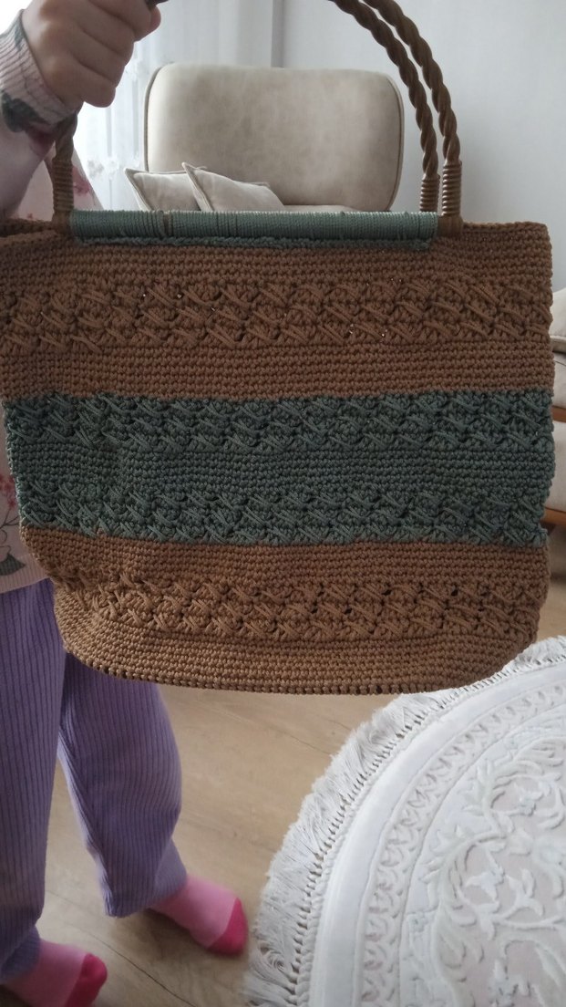 Bu kadın çantası, kahverengi ve yeşil tonlarda örgü detaylara sahip, bohem ve rahat bir tarz sunar. Desensiz ve günlük kullanım için uygundur. el yapımıdır