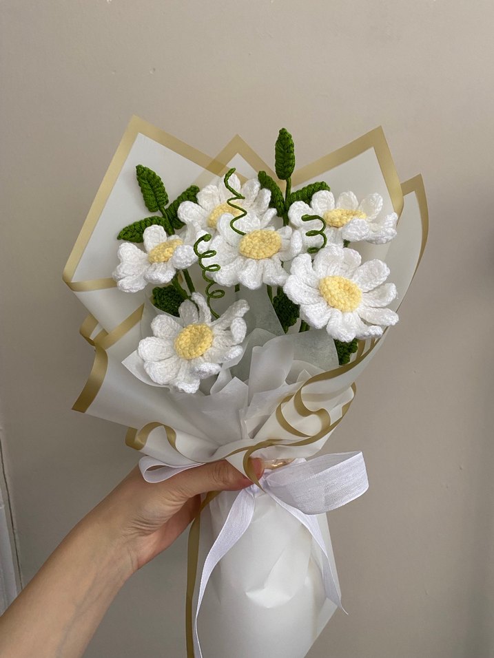 El yapımı bohem tarzda beyaz papatyalar, sarı merkezler ve yeşil yapraklarla süslenmiş örgü buket, beyaz kurdele ile bağlanmış özel kağıtla sarılıdır.