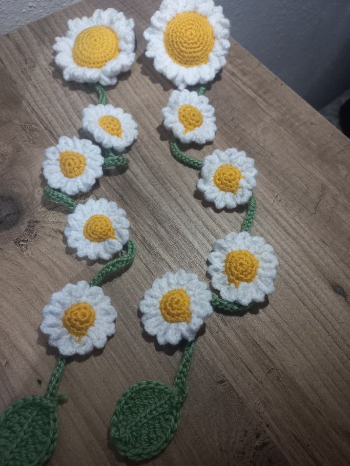 El yapımı bohem tarzda, beyaz yapraklı ve sarı merkezli papatya motifli tığ işi saç örgü tokası