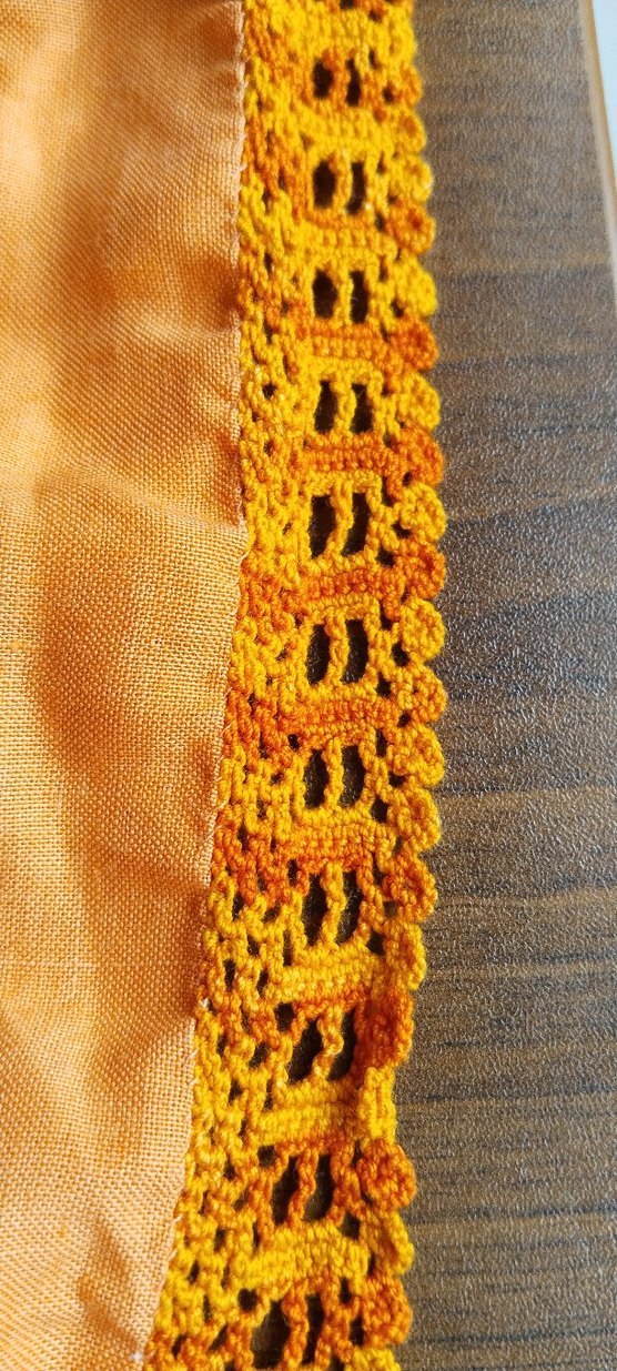 El yapımı sarı dantel kenar, ayrıntılı bohem örgü deseniyle kumaşlara özgün bir dokunuş katıyor. keten