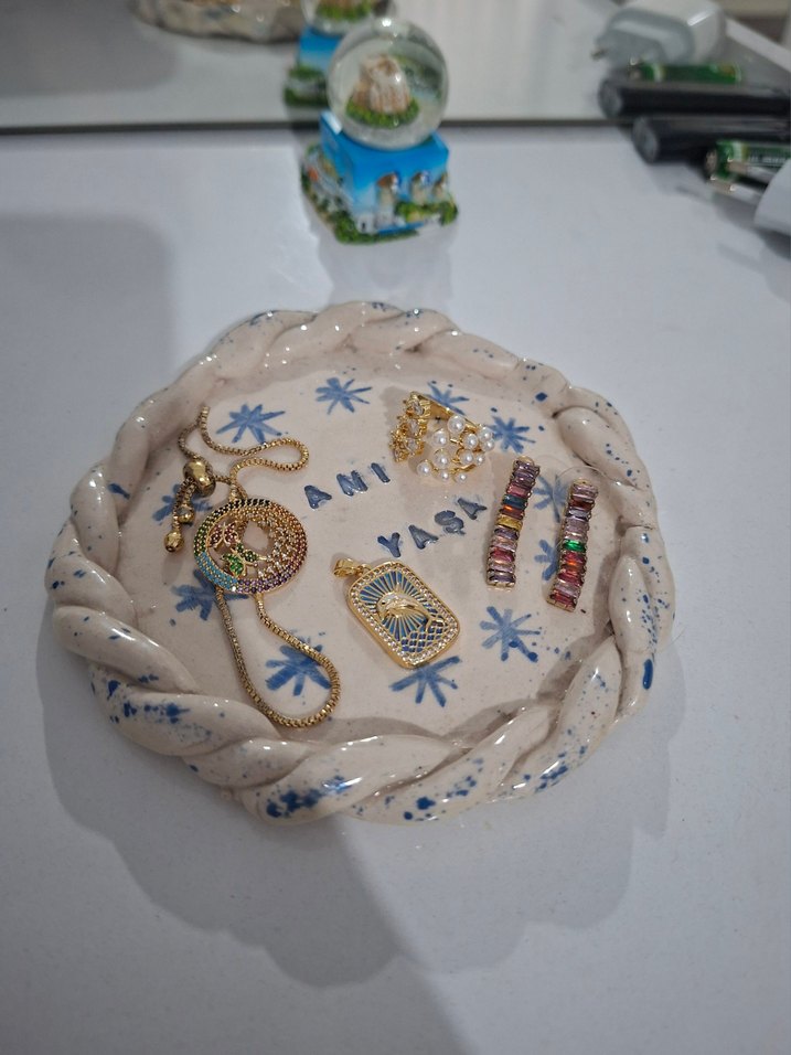 Örgü kenarlı, mavi yıldız desenli ve "Ami Yaşa" yazılı el yapımı seramik takı tabağı. İçinde çeşitli renkli ve altın tonlu takılar bulunur. ✨
