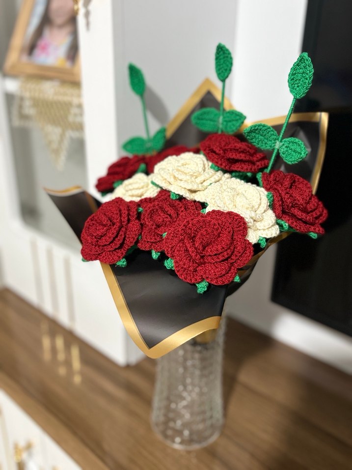 Kırmızı ve krem renkli, yeşil yapraklı el örgüsü güllerden oluşan bohem tarzda el yapımı buket, siyah altın detaylı kağıda sarılı.