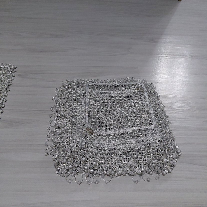 El yapımı Bohem tarzı gümüş renkli dantel örtü, kenarlarında süslü halkalar ve detaylı açık işçilik içerir. 15 parcadan olusuyor orta masa ve pecetelik