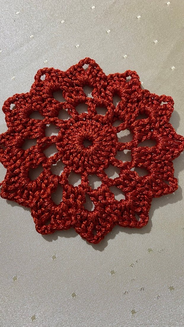 El yapımı, bohem tarzda turuncu örgü bardak altlığı. Yuvarlak ve detaylı desenli, yumuşak dokulu.
