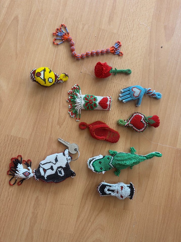 Farklı renklerde el yapımı boncuklu anahtarlıklar, hayvan, kalp ve çiçek figürleriyle detaylandırılmış. Her biri benzersiz ve özenli.