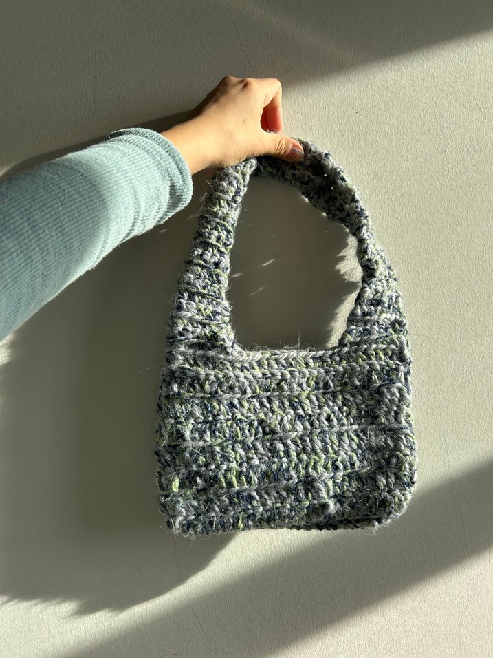 Kendim yaptım gri, yeşil ve simli lacivert iplerden ama baskınlık gride. Minik, el yapımı olduğu anlaşılıyor. Aynısından kendime de yapmıştım severek kullanıyorum, yeni şeyler denemek için buraya da koymak istedim