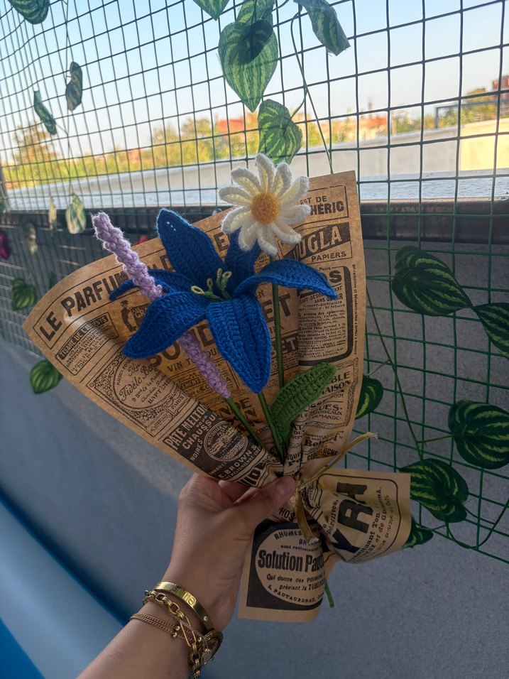 El yapımı çiçek buketi, mavi, beyaz ve mor örgü çiçekler ile vintage baskılı kağıda sarılmıştır.