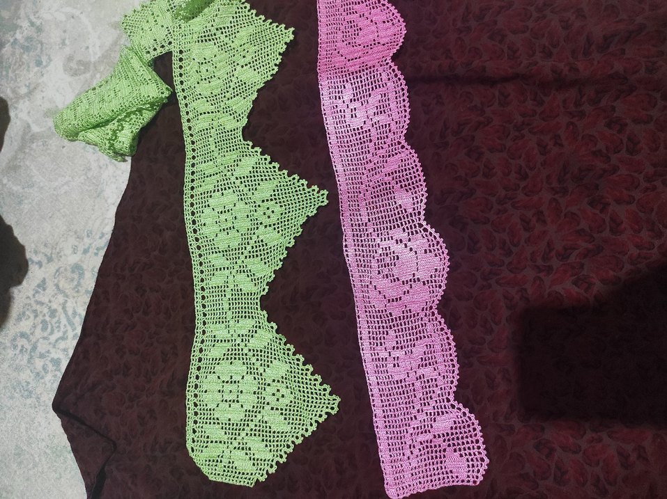 Yeşil ve pembe renklerde el yapımı, çiçek desenli ince dantel şeritler. İnce işçilikle hazırlanmış, zarif bir görünüm sağlar.