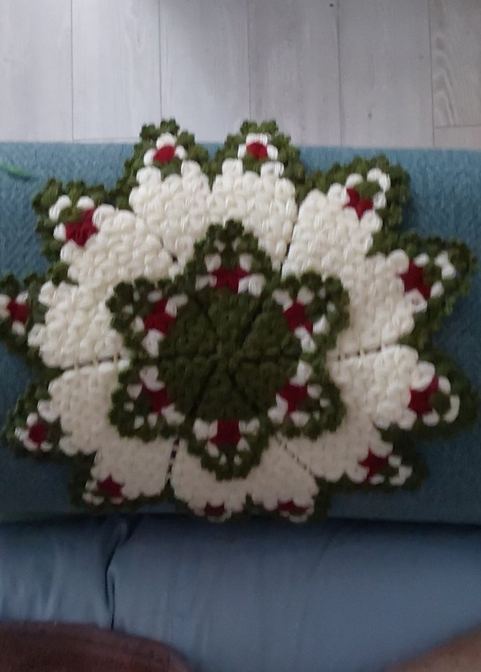 El yapımı, beyaz, yeşil ve kırmızı renklerde çiçek desenli örgü minder.