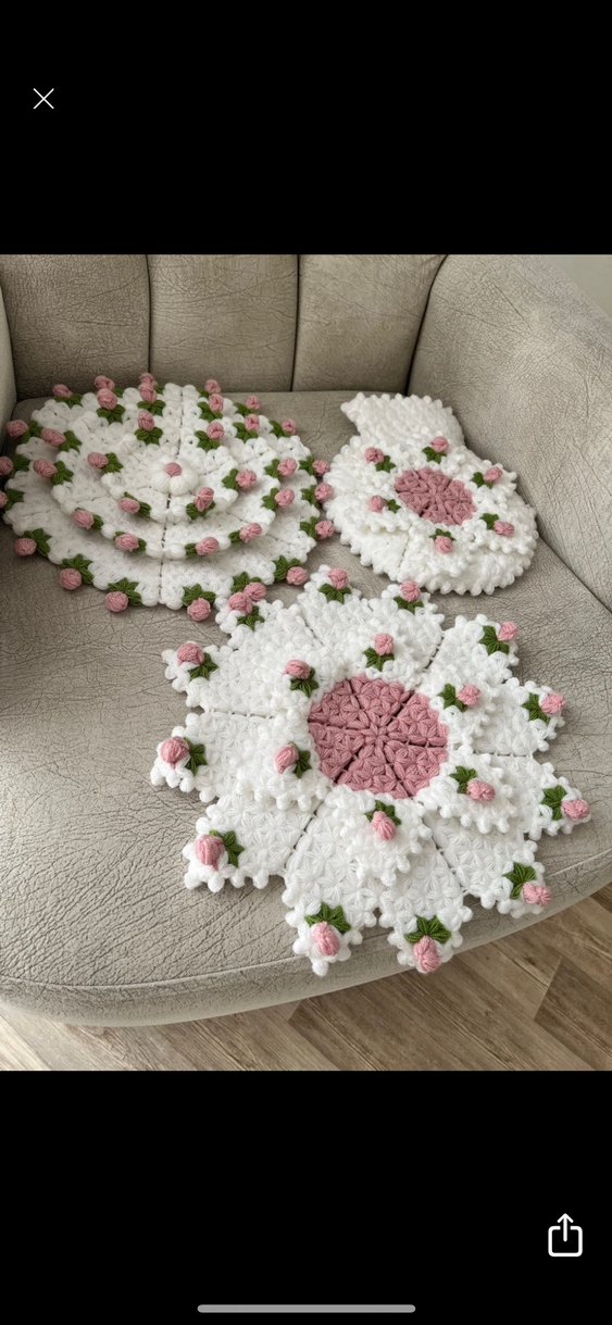 Beyaz, pembe ve yeşil renklerde çiçek desenli el yapımı örgü set