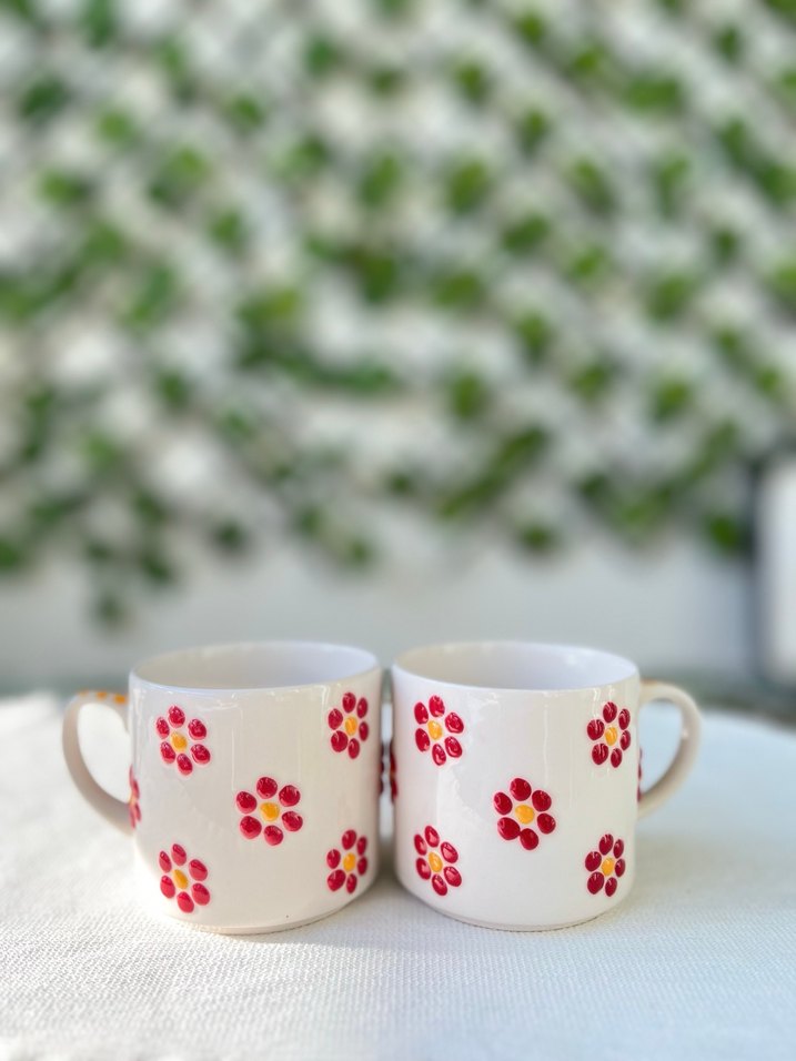 İki adet beyaz seramik kupa, üzerinde canlı kırmızı ve sarı çiçek desenleri bulunur. Favori içeceklerinizi keyifle yudumlayabilirsiniz. ☕