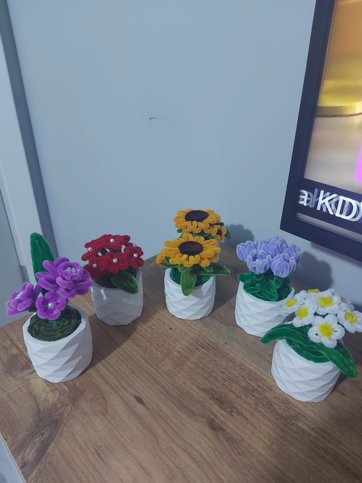 Beyaz dokulu saksılarda renkli keçe çiçeklerle el yapımı bohem tarzda dekoratif saksılar.Adet fiyatı