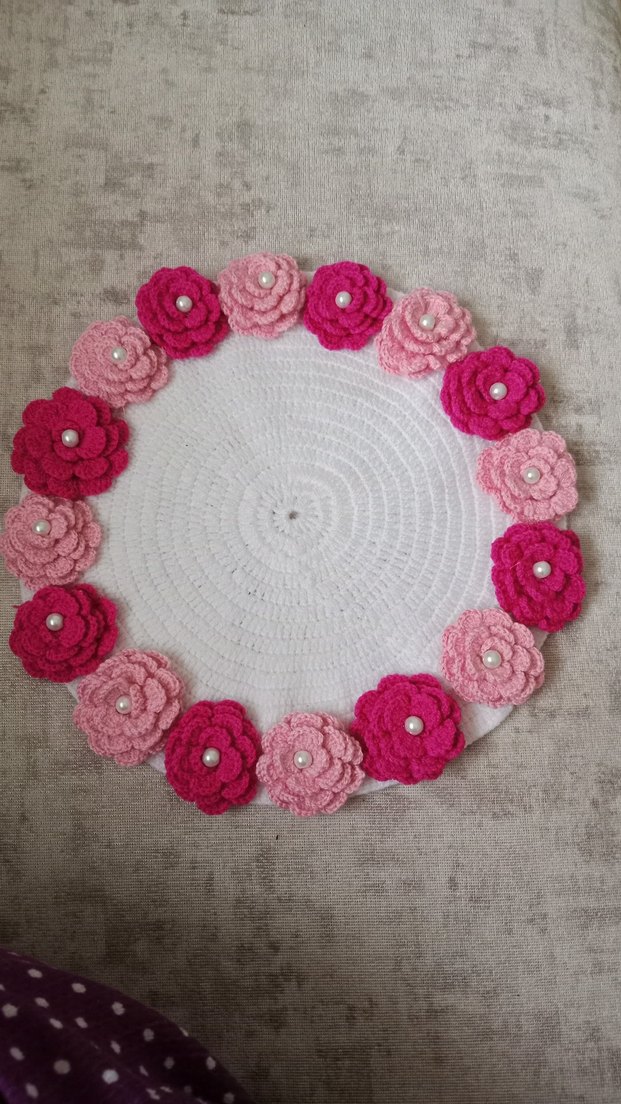 Pembe ve fuşya renkli, inci detaylı çiçeklerle süslenmiş el yapımı bohem yuvarlak örgü lif. istenilen renkte vardır daha hiç kullanilmadi