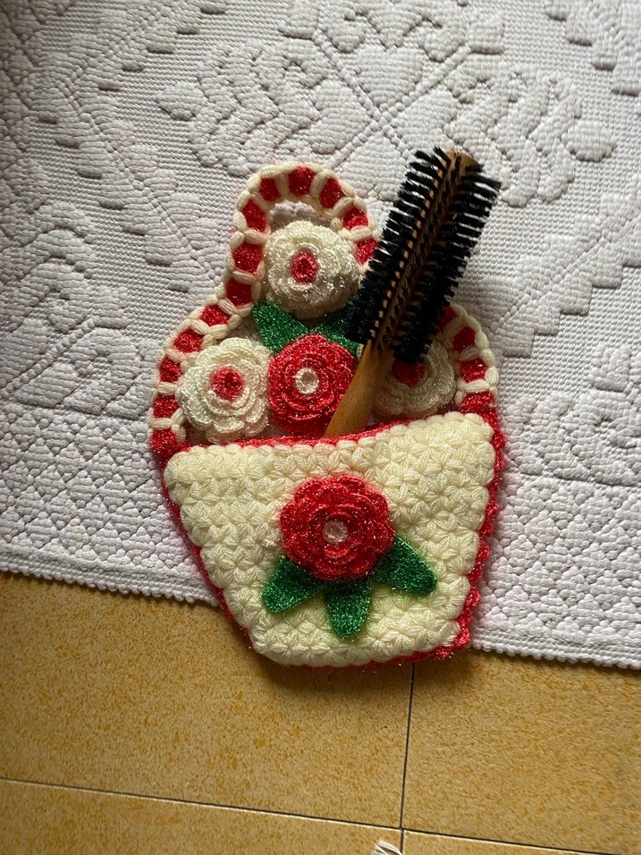 Kırmızı ve beyaz çiçeklerle el yapımı tığ işi saç fırçası tutacağı. Yumuşak ve dekoratif çiçek desenli.