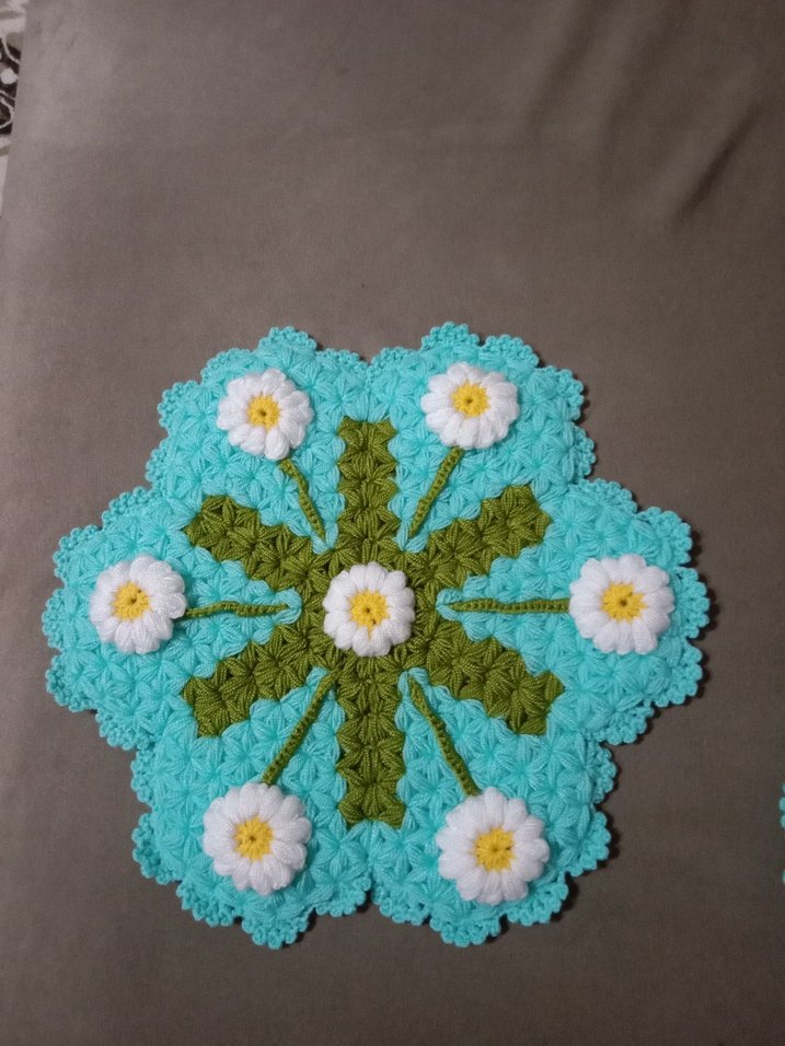 El yapımı, turkuaz zemin üzerine beyaz çiçekler ve yeşil yapraklar içeren çiçek desenli lif seti