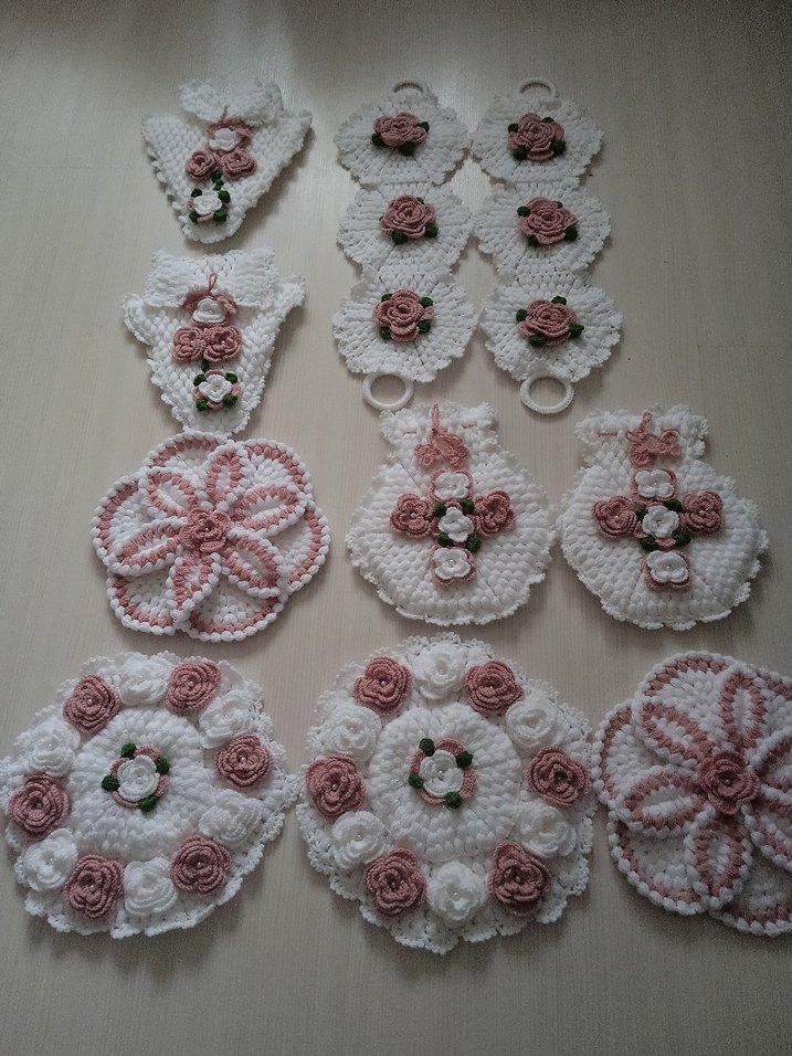 Beyaz ve pembe renklerde çiçekli desenlerle el yapımı örgü dekoratif set, asmak için halkalı çeşitli parçalar içerir.