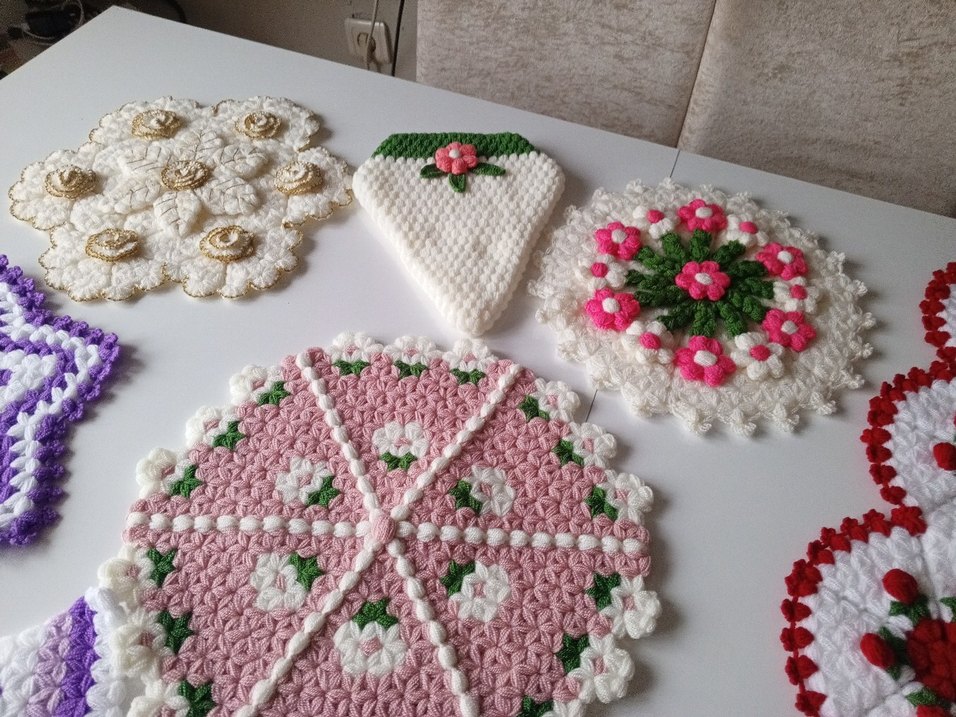 Beyaz, pembe ve yeşil renklerde çiçek desenli, el yapımı örgü dekoratif lifler. Yumuşak dokulu kumaş, her yüzeye zarafet katar. istenilen renklerde örülür