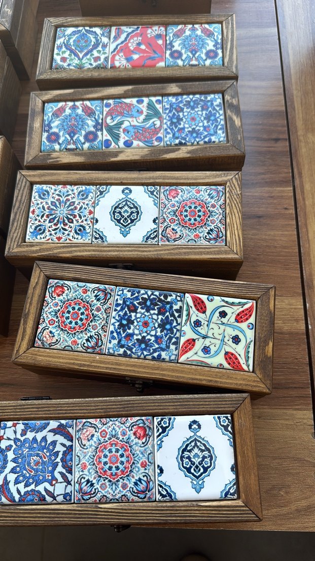 5 x 15 ebatında Üç farklı çini deseninin ahşap çerçeveye işlendiği el yapımı kutular.İçi kadife olup renkli geleneksel desenler taşır. Mücevher, takı,Tesbih kutusu olarak kullanılabilir