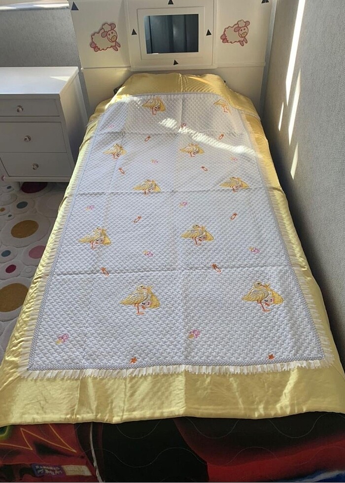 Takım hiç kullanılmadı. Pikenin sarı kısmı, yastık kılıfı ve çarşafı saten . Pike ise pamuklu kumaş. Ölçüleri 100 *200