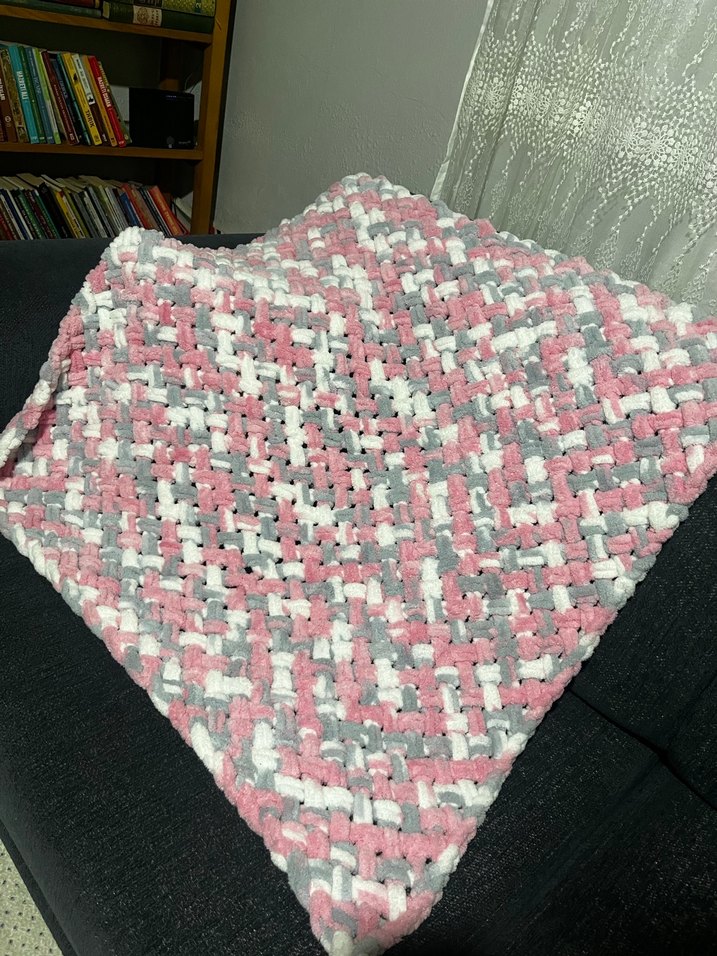 İsteğe göre örülür Gri, pembe ve beyaz tonlarda yumuşak örgü çocuk battaniyesi, sıcaklık ve konfor sağlar.