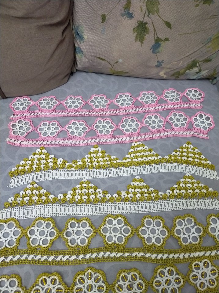 Pembe ve zeytin yeşili renklerde, çiçek desenli el yapımı dantel kenar süslemeleri. Geleneksel tasarımlar ve ince halka detayli simli ipten yapılık adet fiyatı 250