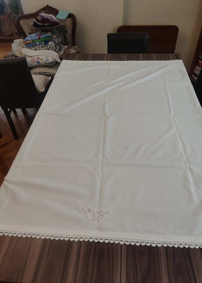 Ürünler bir adet masa örtüsü, bir adet runner, bir adet fiskos örtüsü, 14 adet peçete olarak mevcuttur. Masa örtüsü: 130-135 Runner: 143-51 Fiskos: 79-79 Peçete: ortalama 35e 35