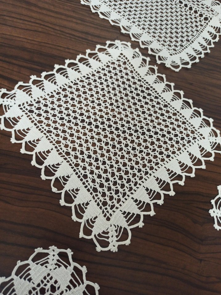 El yapımı, kare şeklinde dantel örtüsü, narin dantel deseni ve dalgalı kenarlarla geleneksel bir hava katıyor.