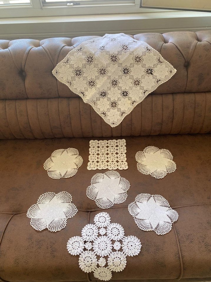 Çeşitli çiçek ve geometrik desenlere sahip, ince beyaz ipliklerle yapılmış el yapımı dantel örtüler seti. Geleneksel dekor için uygundur.