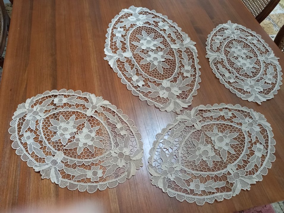 Çiçek desenli, geleneksel tarzda el yapımı dantel oval masa örtüsü seti.