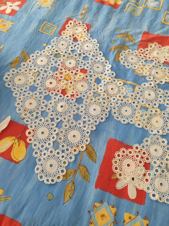 El yapımı dantel masa örtüsü, renkli kumaş üzerine detaylı yuvarlak desenlere sahiptir. Her mekâna zarif ve sanatsal bir dokunuş katar. hiç kullanılmamış yenidir