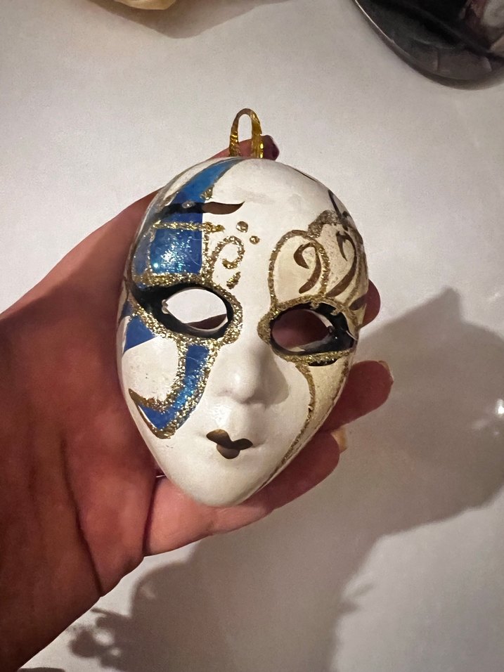 El yapımı, beyaz zemin üzerine mavi ve altın sim detaylı dekoratif kadın maskesi. Göz delikleri ve asma halkası bulunmaktadır.