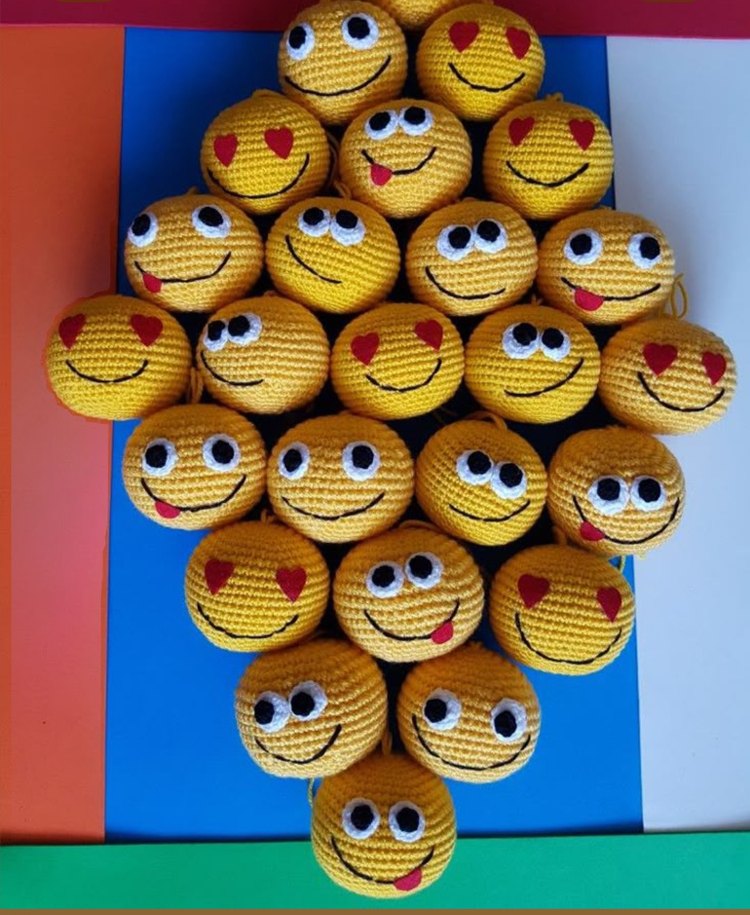Parlak sarı ipten yapılmış, çeşitli ifadeleri olan el yapımı tığ işi emoji figürleri. Her biri farklı yüz ifadeleri içerir.