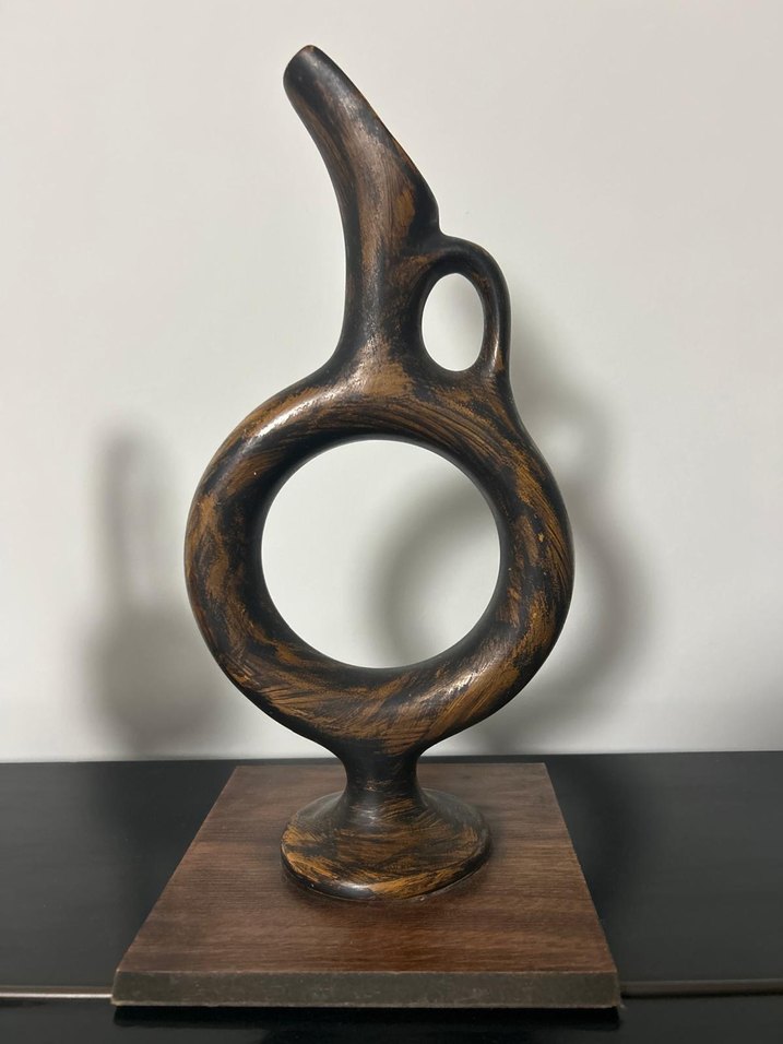 Anadolu medeniyetlerinin izlerini taşıyan, ikonik Hitit Güneşi formunda tasarlanmış şık bir seramik parçadır. Tasarım: Hitit geleneğinde şarabın güneşten süzülmesini simgeleyen ortası boşluklu özel form. Doku: Antik bir görünüm kazandırılmış, bronz ve siyah tonlarında eskitme çalışılmıştır. Durum: Tertemiz durumdadır; çatlak, kırık veya tamir görmüş bir yeri yoktur. Kullanım: İster dekoratif obje olarak vitrin/kitaplıkta, isterseniz de sofralarda şık bir sunum parçası olarak kullanılabilir. Evinize otantik ve sanatsal bir hava katacak nadide bir parçadır. Özenle paketlenerek kargolanacaktır.