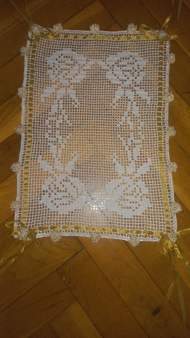 Çiçek desenli, kenarları ince işçilikle süslenmiş el yapımı geleneksel dantel örtü, kurdele detaylı.