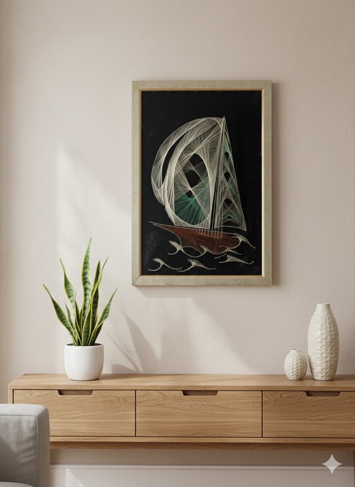 Geometrik bir düzenle yelkenli formuna dönüştüğü bu eşsiz parça, evinize hem derinlik hem de nostaljik bir hava katacak. Siyah kadife dokulu zemin üzerindeki bakır ve fildişi tonlarındaki ipler, ışığın geliş açısına göre farklı parıltılar sunar. Ölçüler: 65.5 cm (Boy) x 46.5 cm (En)
