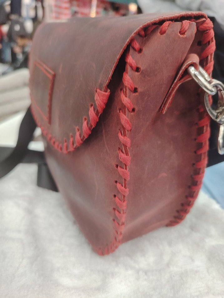 El yapımı bordo renkli hakiki deri kadın çantası, düğmeli kapama özelliğine sahiptir. Vintage ve bohem tarzı bir arada sunar.