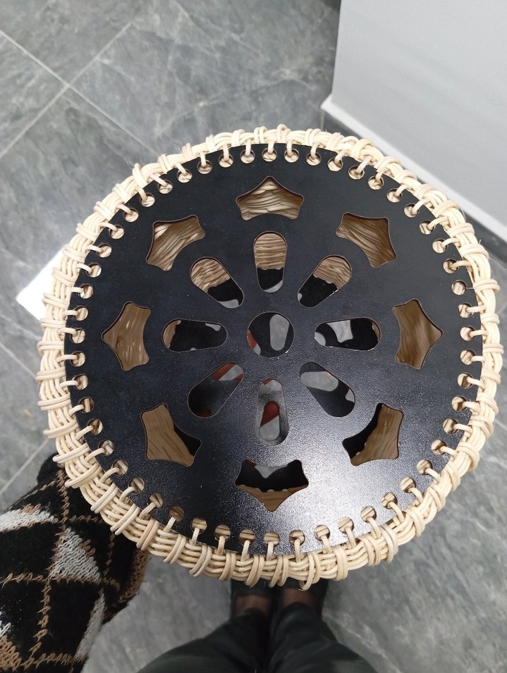 Siyah ahşap oyma desenli üst yüzey ve hasır kenar detayına sahip el yapımı dekoratif kapaklı sepet.Rattan ile örülmüştür.