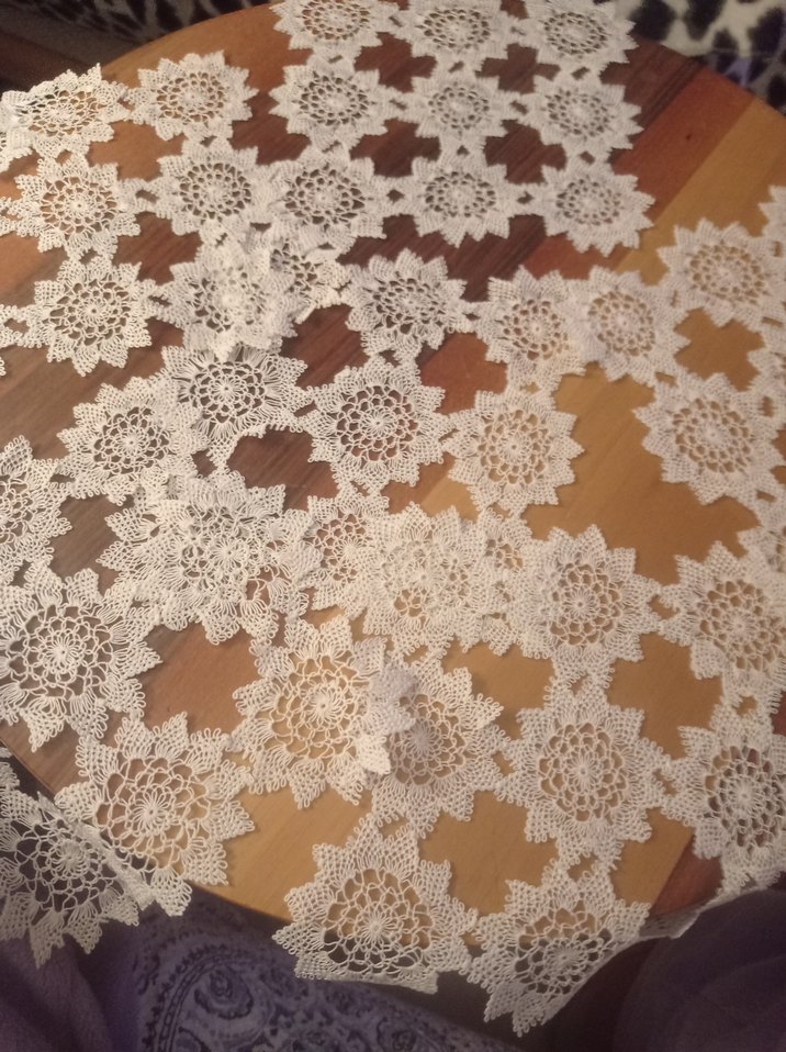 El yapımı bohem tarzda, ince çiçek desenlerine sahip iğne oyası 12 parça vitrin bir parça dikdörtgen toplam 13 parça çapa ipten yapılmıştır