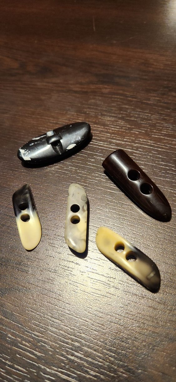 İki delikli, el yapımı doğal düğmeler. Her biri farklı şekil ve renk tonlarına sahip, el işçiliğine özgünlük katar. ✂️