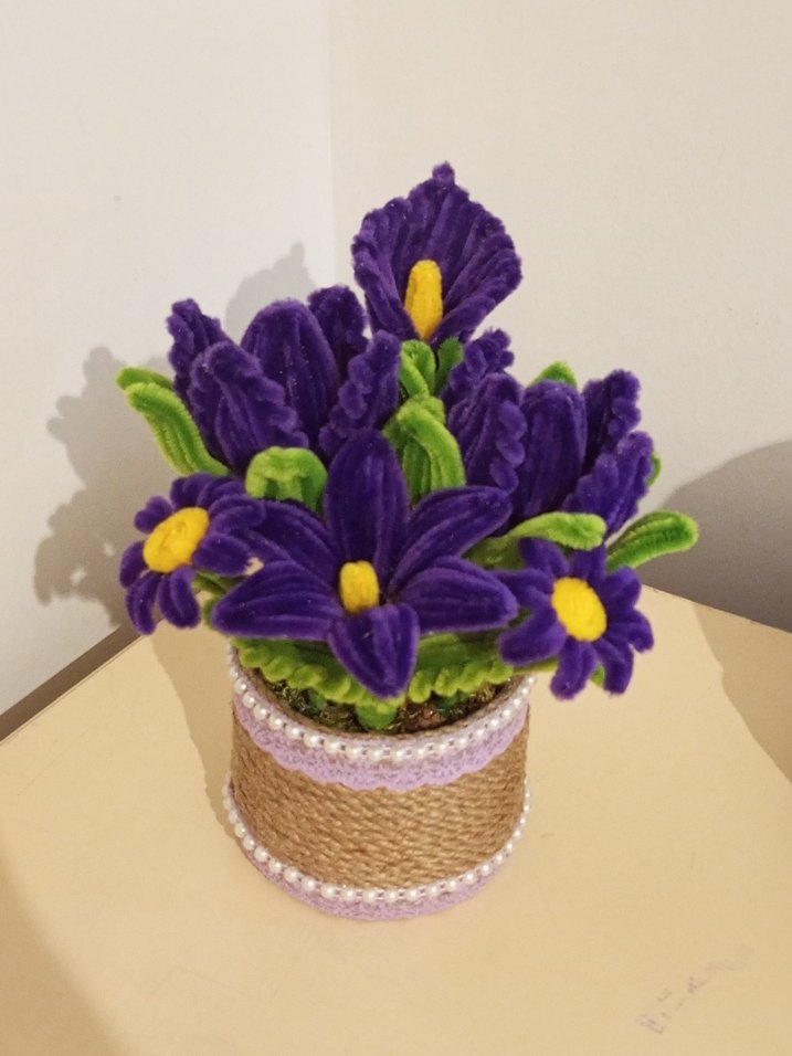 İnci ve dantel süslemeli bohem tarzda el yapımı kadife çiçekler. Mor ve sarı renkli çiçekler canlılık katıyor.