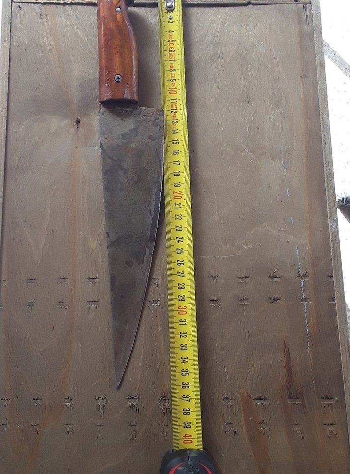 Yaklaşık 40 cm uzunluğunda, ahşap saplı koyu kahverengi bıçak. Bıçağın yüzeyi rustik ve kullanılmış görünümlü.