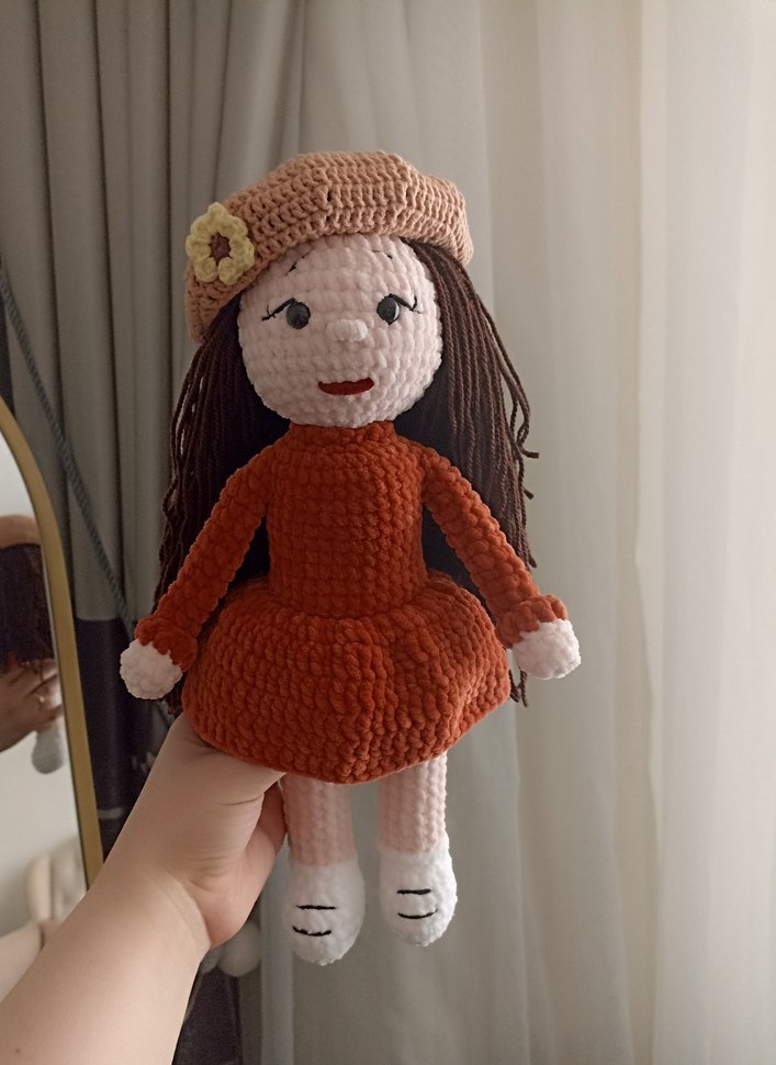 Yumuşak el yapımı bebek, kahverengi saçlı, renkli turuncu elbise ve çiçek detaylı bej şapka ile. Şirin bir koleksiyonluk oyuncak.