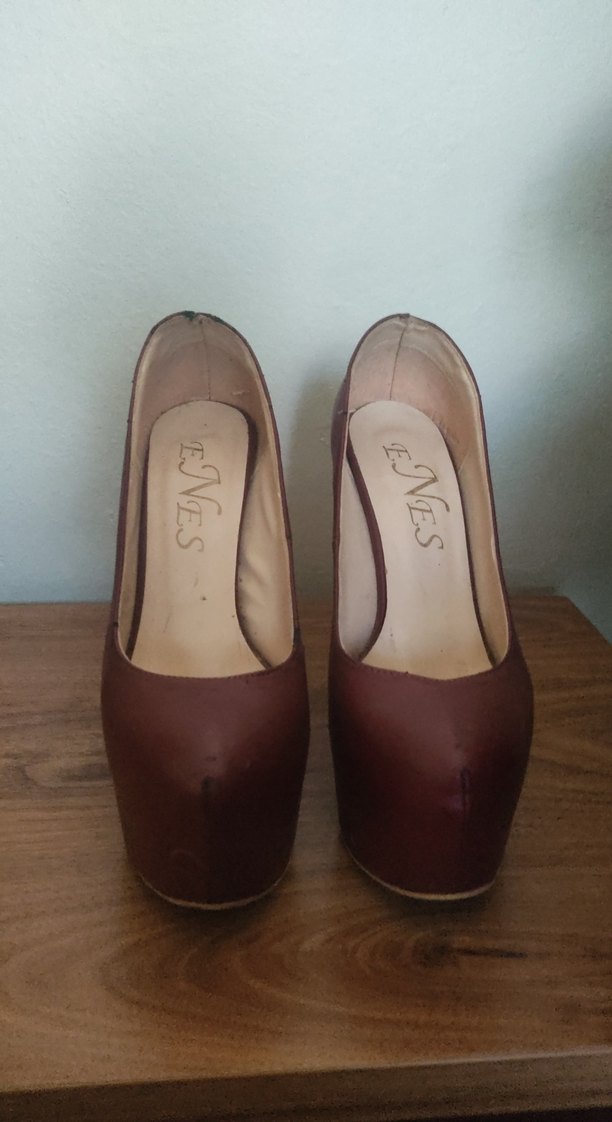 Parlak kahverengi bordo karışımı deri platform topuklu stiletto,iç kısmında ENES yazısı bulunur. 1 defa giydim.çok kullanılmadı fiyatta yardımcı olurum.Küçük bir kusuru mevcut.