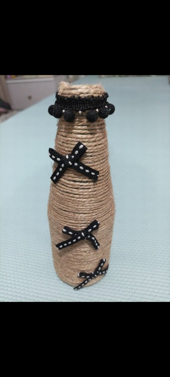 Doğal kahverengi hasırla sarılmış, siyah kurdele ve ponpon süslemeli el yapımı vazo. Rustik ve el işi görünümüne sahip.