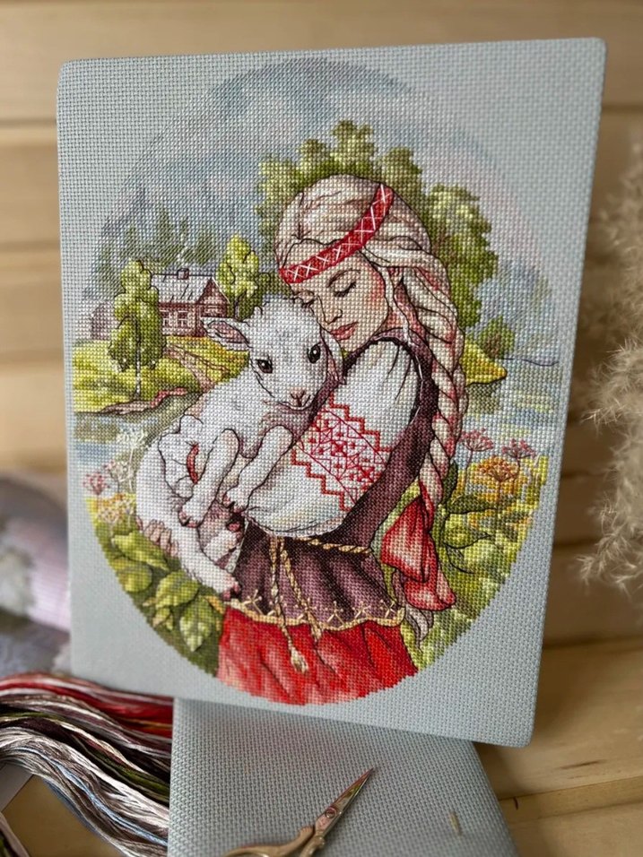 El yapımı kanaviçe tablosu Kız ve Kuzu