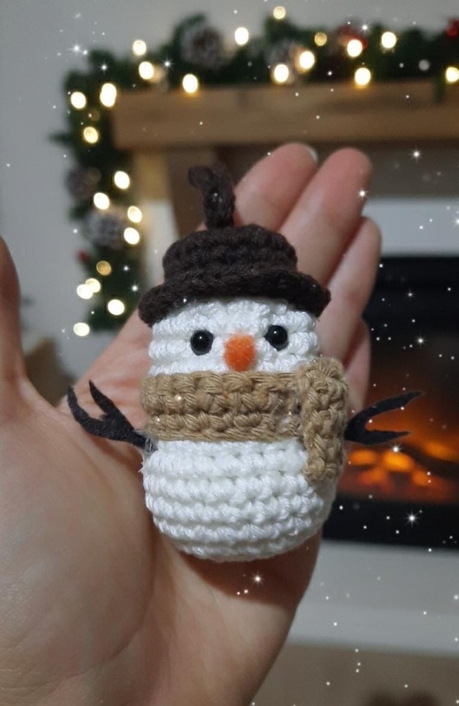 Kahverengi şapka ve atkı ile el yapımı küçük kar küresi peluş oyuncak. Renkli detaylara ve yumuşak dokuya sahiptir. ❄️