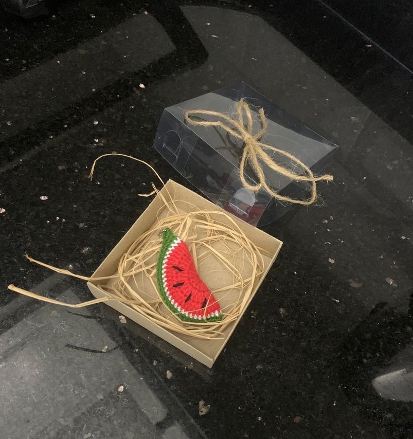 Renkli ipten el yapımı bohem tarzda karpuz figürü, doğal saman dolu kutuda, şeffaf kapak ve ipli fiyonk ile sunulmuştur .