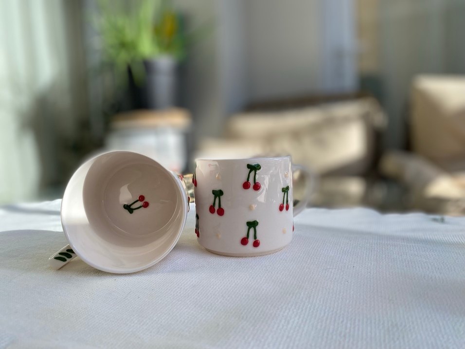 El Yapımı Kiraz Desenli Renkli Seramik Kupa