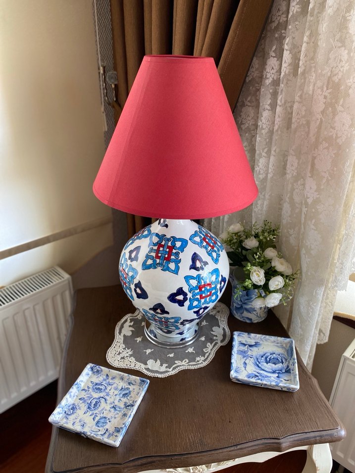El Yapımı Kırmızı Abajur ve Desenli Seramik Gövde