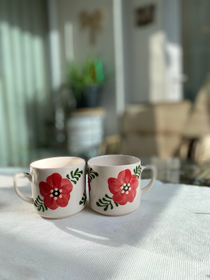 Marka Temsili, adet fiyatıdır. Kırmızı çiçek ve yeşil yaprak desenli beyaz seramik kupalar, sıcak içecekler için uygundur. ☕